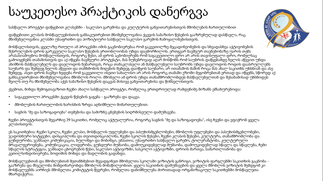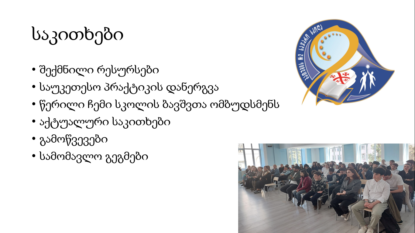 სასწავლო წლის ბოლო დღეს, ჩვენს სკოლაში, სკოლის ბავშვთა ომბუდსმენის ანგარიშის პრეზენტაცია გაიმართა.ანგარიშის ფარგლებში შეჯამდა გაწეული სამუშაობი, შექმნილი რესურსები, დანერგილი სიახლეები: საუკეთესო პრაქტიკა საკლასო გარემოს გაჯანსაღებისთვის, წერილი ჩემი სკოლის ბავშვთა ომბუდსმენს. ასევე აღინიშნა აქტუალური საკითხები, გამოწვევები და სამომავლო გეგმები.